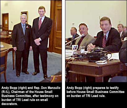 Andy Bopp, SGCDpro's Director of Public Affairs, testified in May before the House Small Business Committee on EPA's efforts to reduce the TRI Lead rule reporting burden for small glass and ceramic decorators. The hearing focused on current efforts by the Office of Management and Budget (OMB) to work with federal agencies including EPA to minimize regulatory burdens on small business. House Small Business Committee Chairman Don Manzullo (R-IL) commented after Bopp's testimony that small American manufacturers including glass and ceramic decorators "should not have to fight their own government along with foreign competitors and foreign governments." He also demanded that EPA provide his Committee with details of its efforts to streamline the TRI reporting process for small businesses.